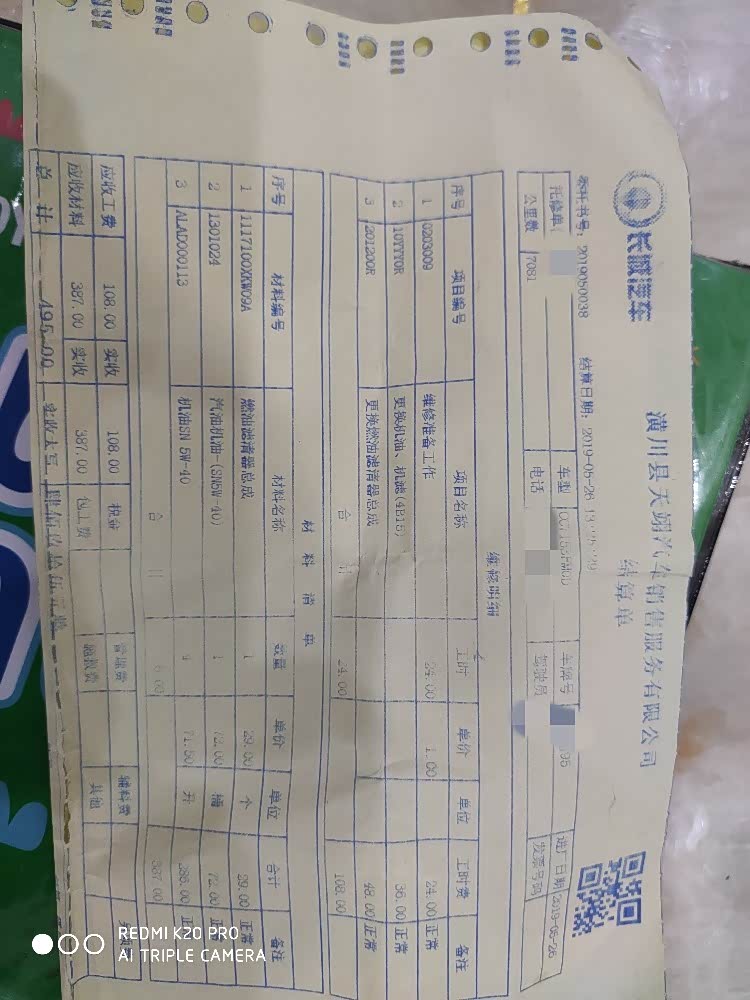 首保用的5w-30二保直接给我用的美孚速霸2000 5w-40油耗上来一个!!!保养用5升加机滤加工时共495块!!!!价格不便宜呀