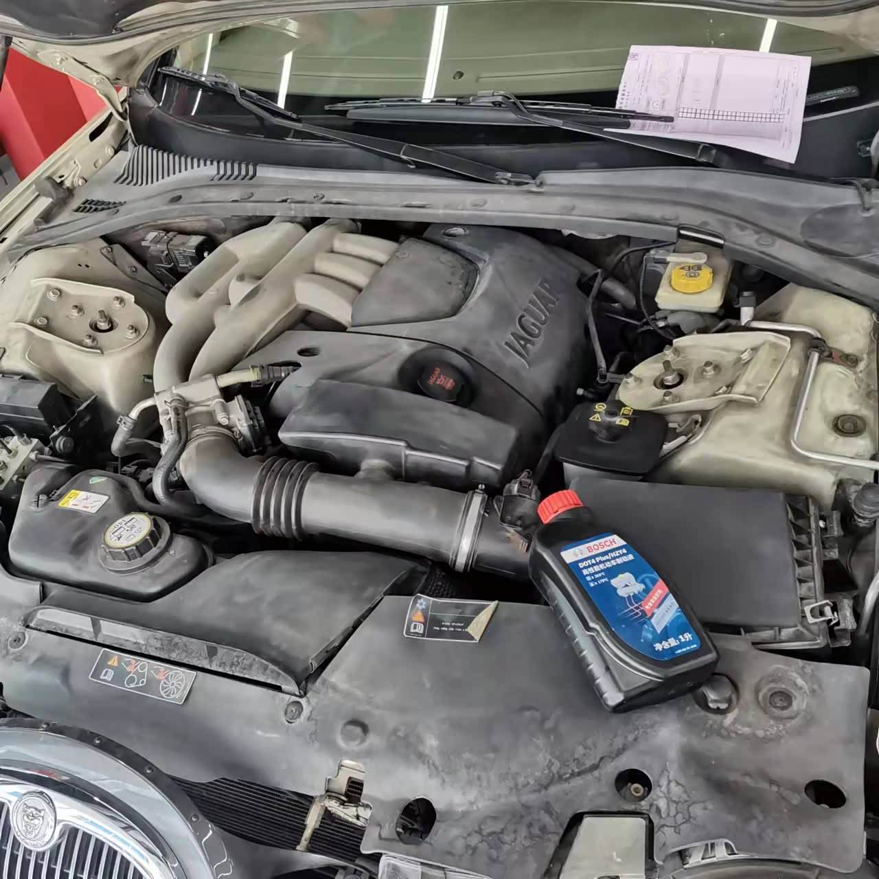 这台车是04款的捷豹,已经行驶里程超过107593万公里,经过详细的检查后,主要更换发动机机油、机油滤清器、还有刹车油的添加,总共收费860元。