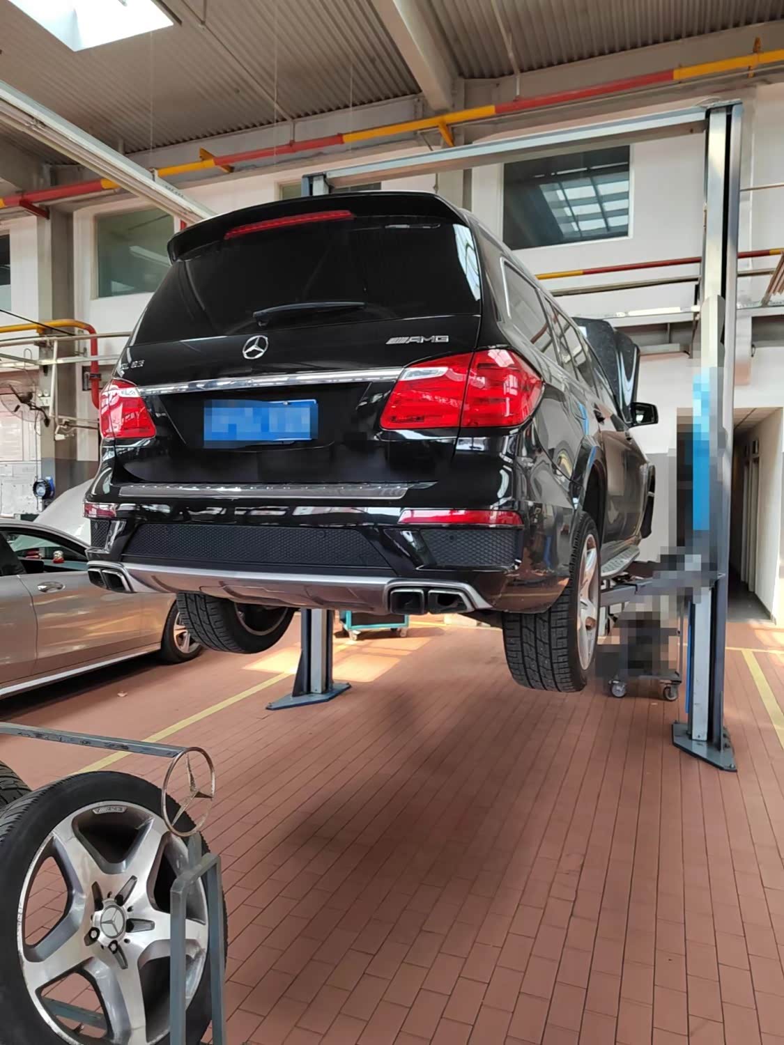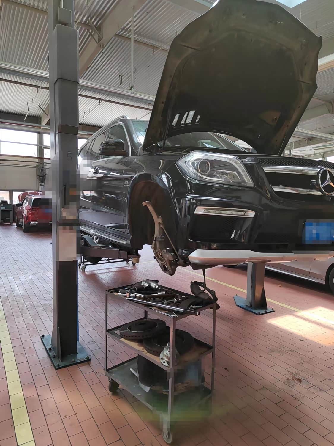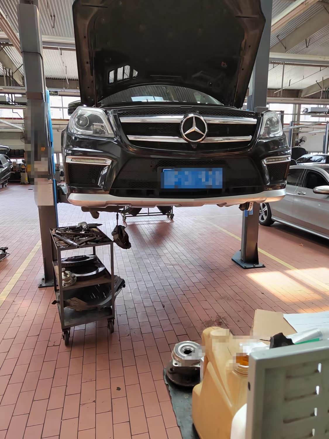维修保养到店一台奔驰gl63,行驶里程17w公里,检查车身时发现车身偏低且倒车时有异响,所以对左前减震器和制动盘及摩擦片进行更换处理,再更换刹车传感器,最后对维修部分进行润滑处理,确保车辆日常使用