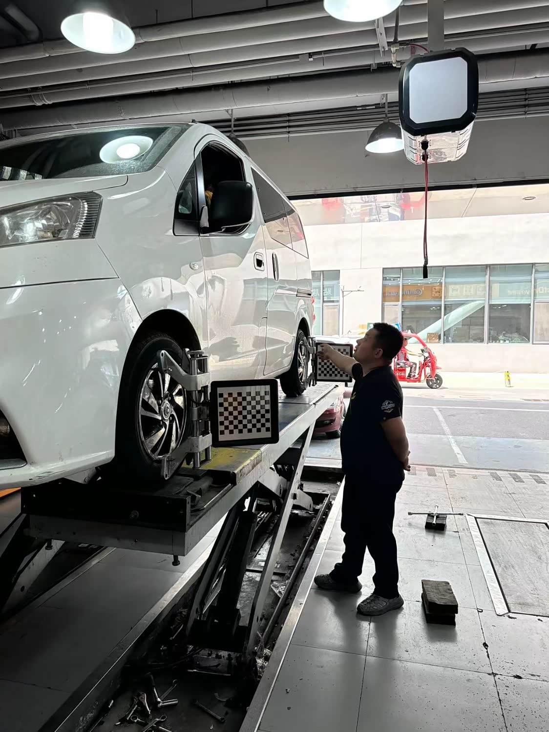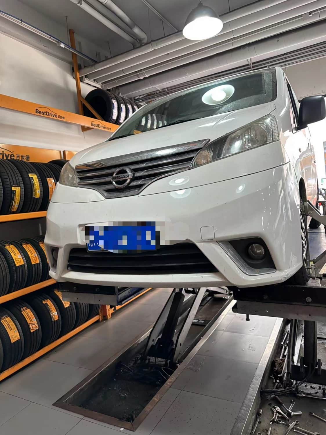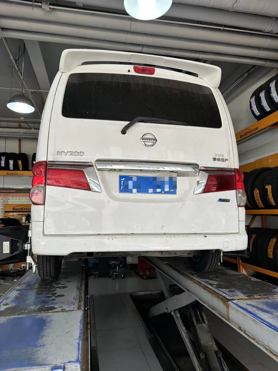 车型日产NV200,公里数104883,本次到店做四轮定位,四轮定位可以确保车辆的轮胎角度和位置正确,以及轮胎的接地面积均匀,从而提高车辆的行驶稳定性,减少悬挂系统和轮胎的磨损。