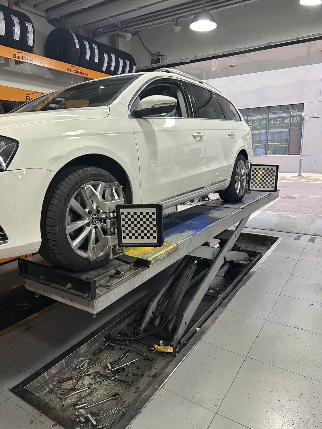 车型大众迈腾,公里数34213,做四轮定位,四轮定位是对整车行车轨迹的检查修正,包括悬挂、底盘、零部件等的调整;动平衡仅仅是把轮子的质量分布变得均衡一点,让其转起来更圆。