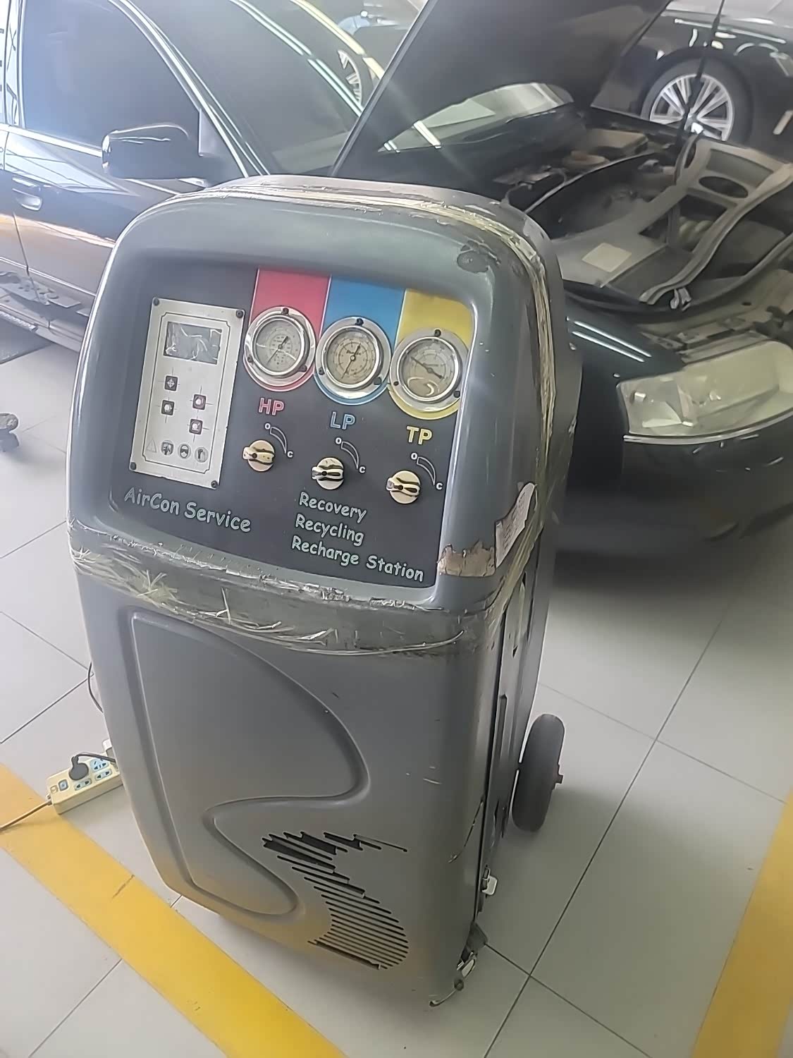 车辆空调不凉。经过检查,是缺少制冷剂造成的。更换空调开关后,师傅正在添加制冷剂