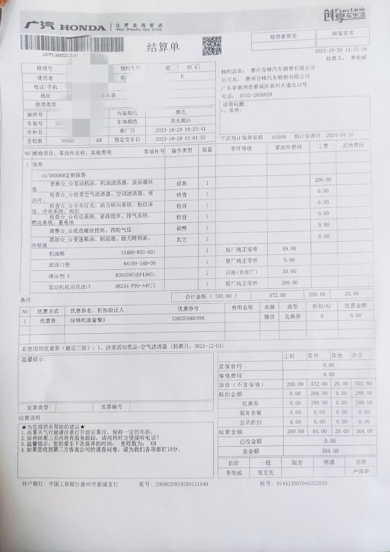 保养地点:广汽本田华神