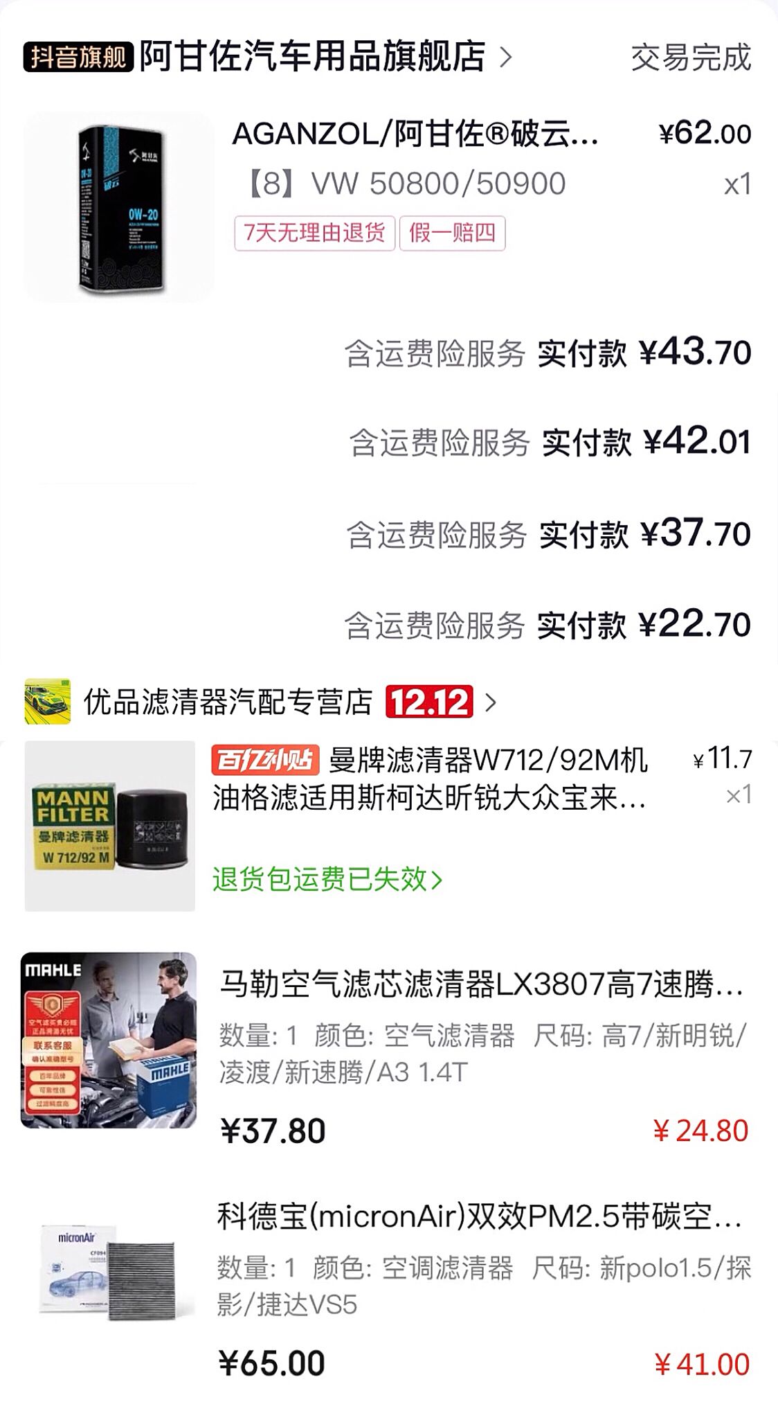 发动机机油、机油滤清器、空气滤清器、空调滤清器