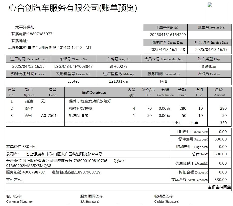 保养项目:空气滤清器、机油滤清器、发动机机油