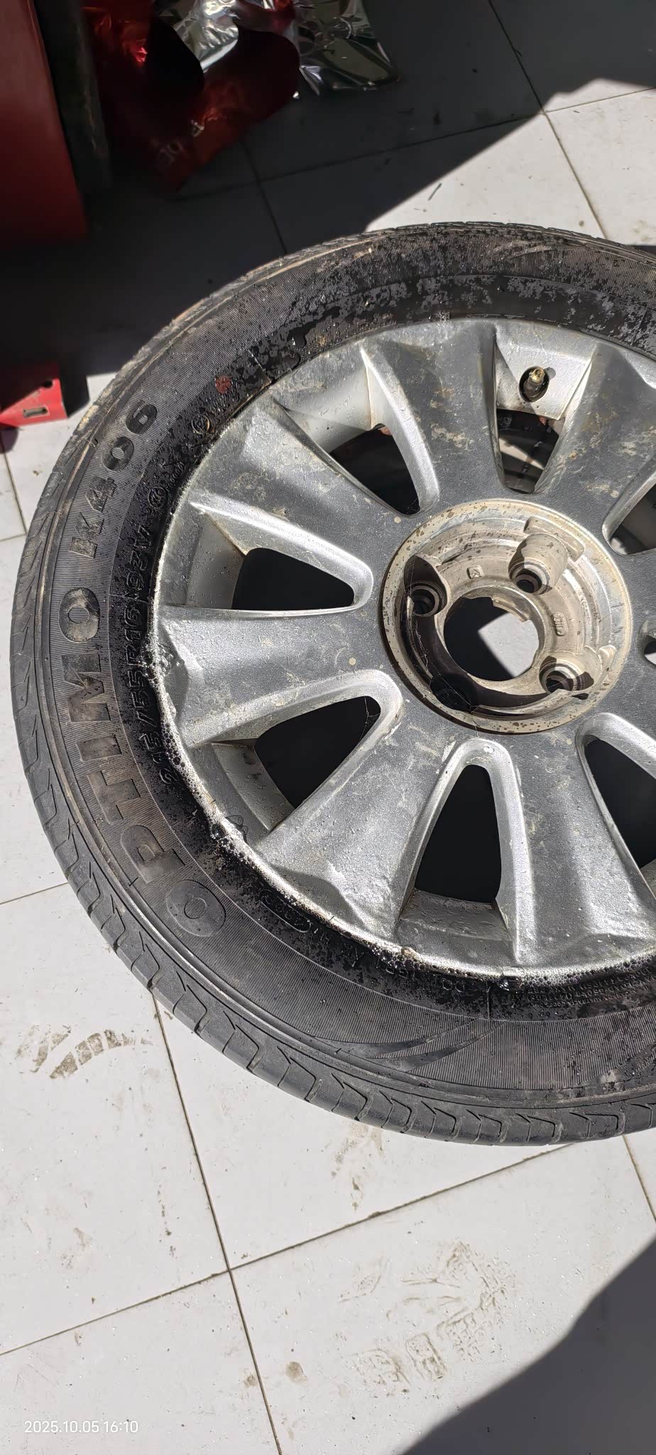 途虎APP上定购两条韩泰轮胎 万途仕 H452 215/55R16 97W Hankook,把原来已经用了五年的经常跑山路打滑的前轮换到后轮安起来,右后轮打气几天就扁了 不得不换。想着把左后轮胎换到全尺寸备胎轮毂上备用,师傅看了备胎完好但轮毂废了买一个要几百块不划算。