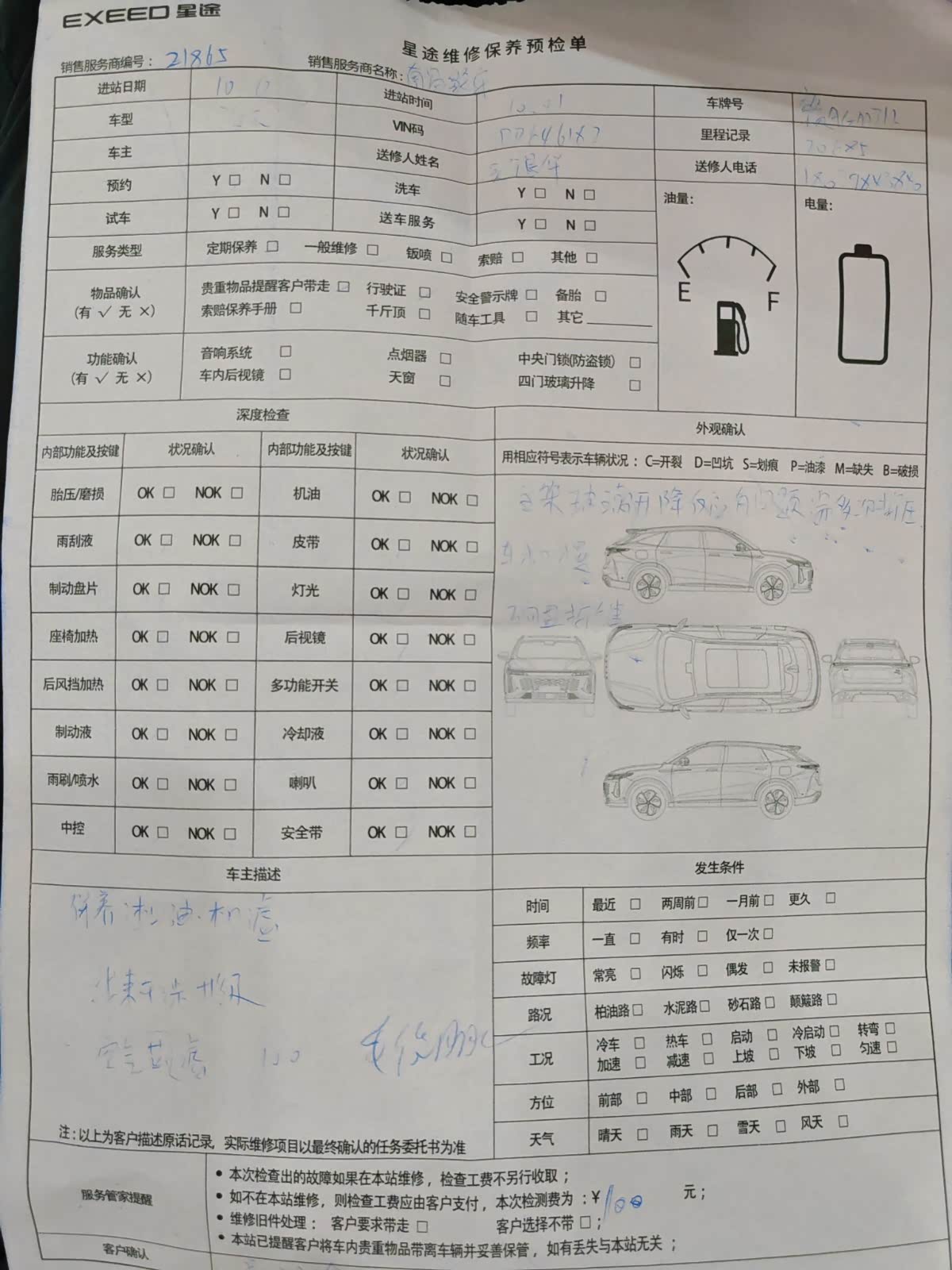 第四次保养 常规保养:机油机滤(含工时)0元 另外自费更换空气滤芯(含工时)100元 免费做了线束干涉升级。