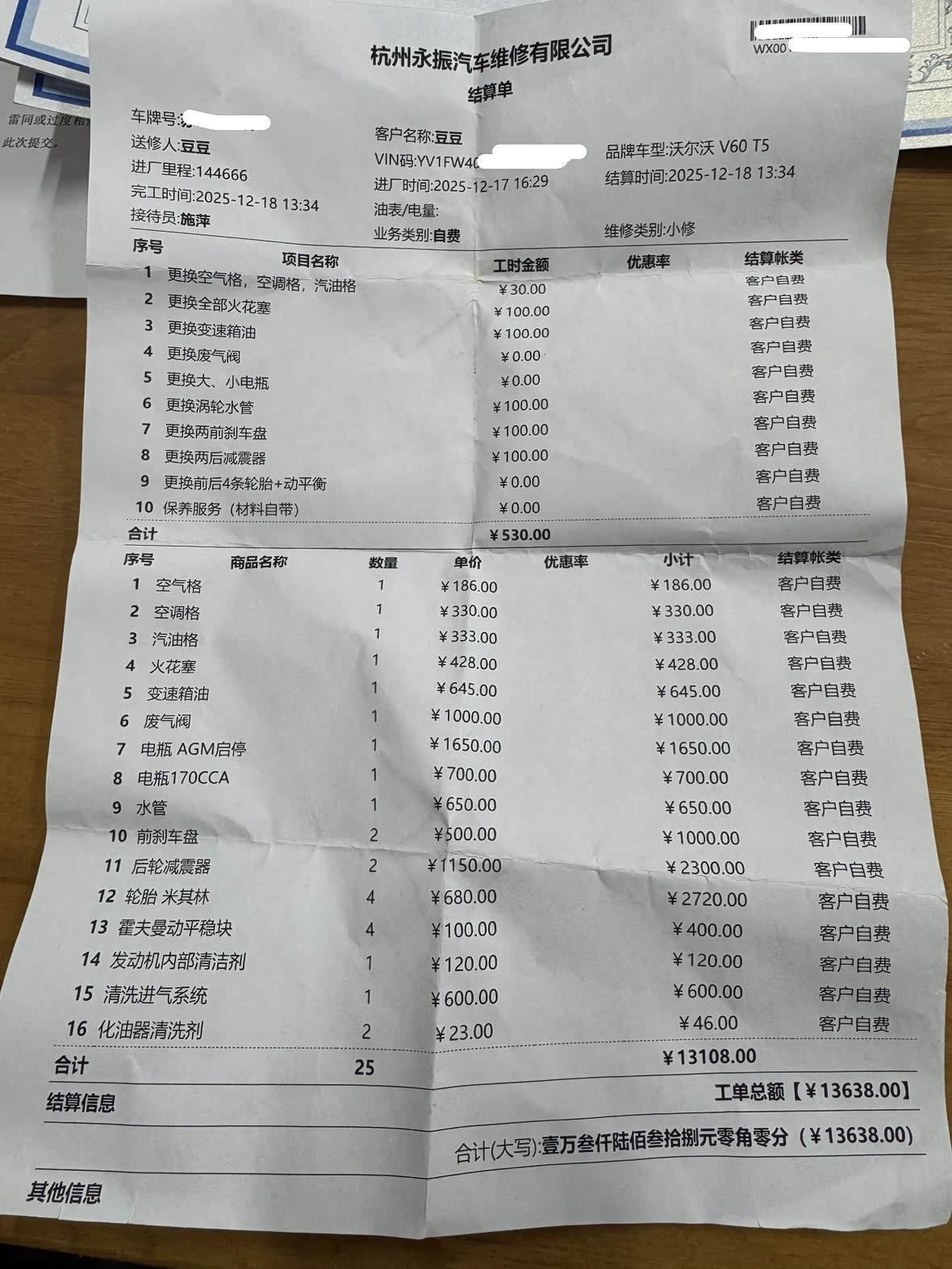 保养里程:143641公里花费:15826元保养日期:2025-12-18项目:后减震KYB、前刹车盘、涡轮水管、电瓶170CCA、电瓶AGM启停、废气阀、霍夫曼动平衡、车轮胎米其林、发动机清洗、节气门清洗、火花塞、变速箱油、燃油滤清器、空气滤清器、空调滤清器、机油滤清器、发动机机油