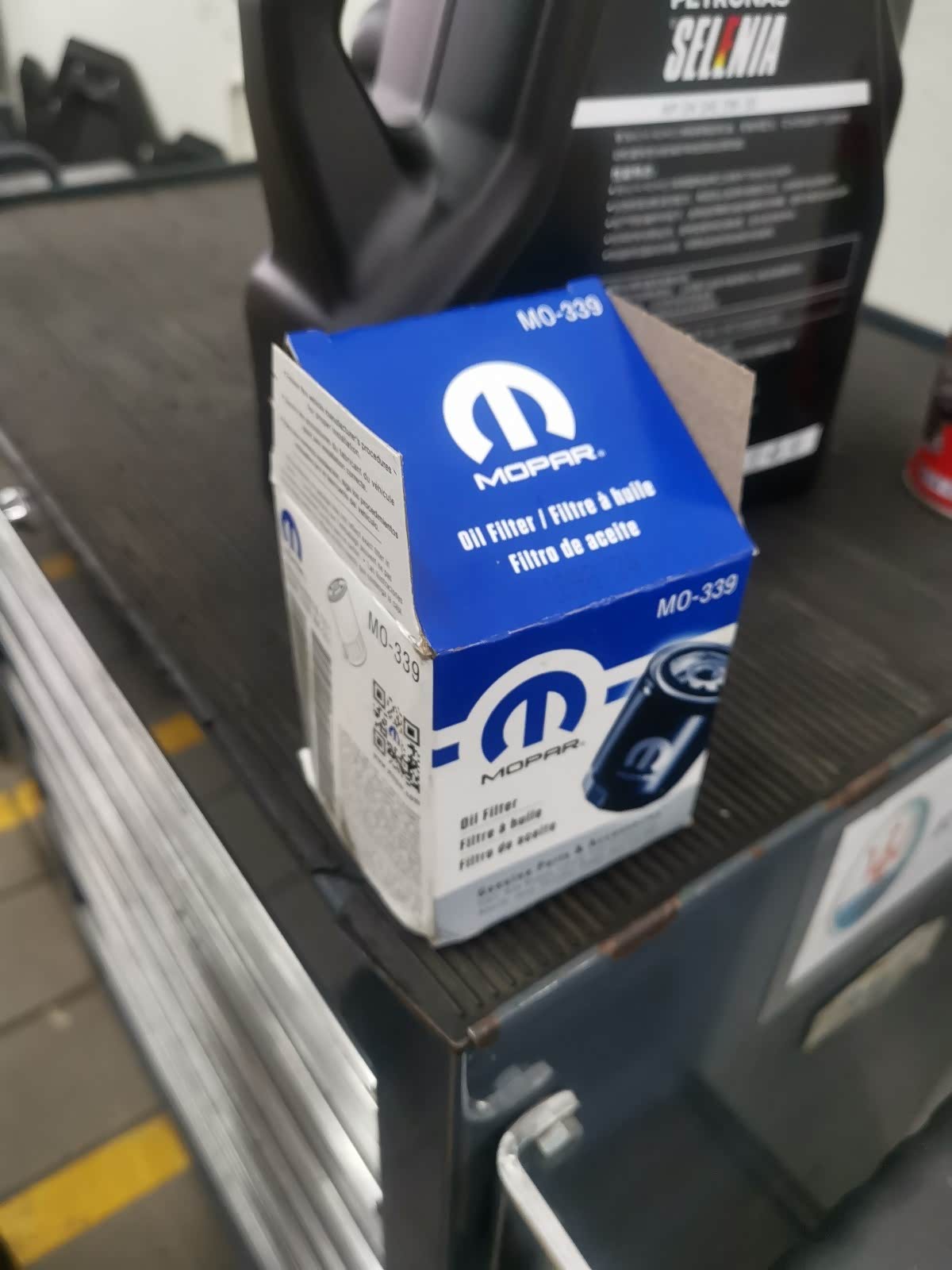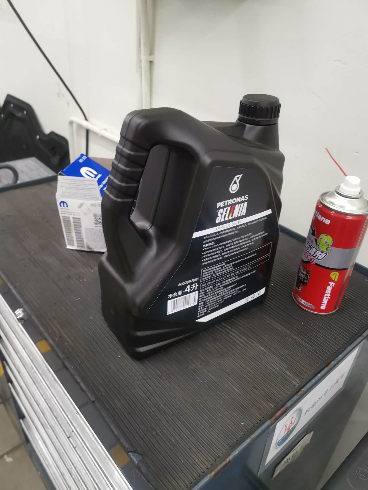 师傅非常用心, 由于是新车,不放心亲自看了全过程, 放干净旧油, 并使用了清洗剂去除残留, 全过程非常细心负责,MOPAR机滤 SELENIA机油5.2升 ,并检查了底盘等。