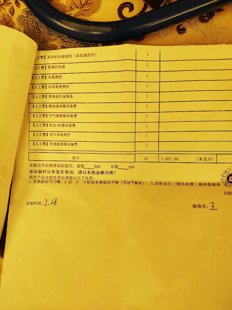 保养里程:39860公里花费:1667元保养日期:2019-02-28项目:发动机清洗、燃油滤清器、防冻液、制动液、空调滤清器、刹车系统保养、空气滤清器、机油滤清器、发动机机油